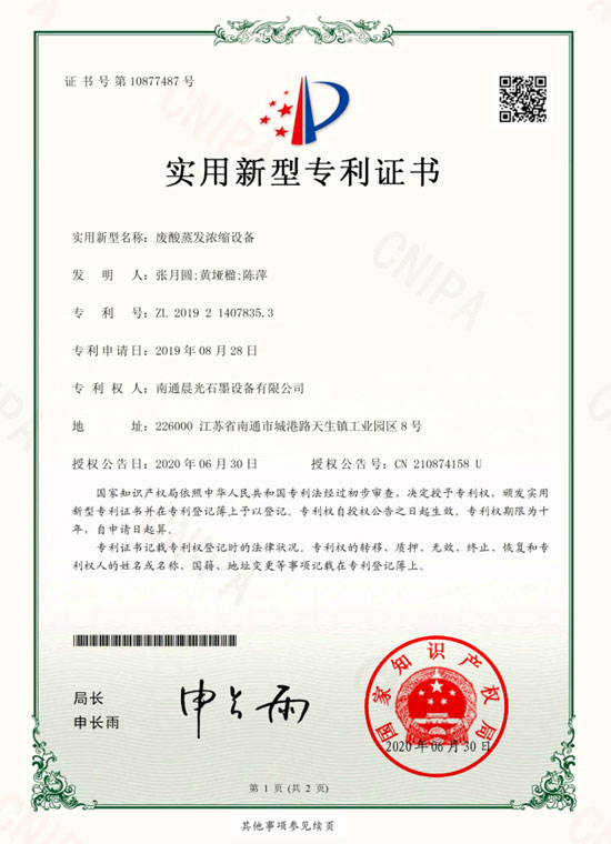 實(shí)用新型專(zhuān)利 :廢酸蒸發(fā)濃縮設(shè)備 專(zhuān)利號(hào):ZL 2019 2 1407835.3