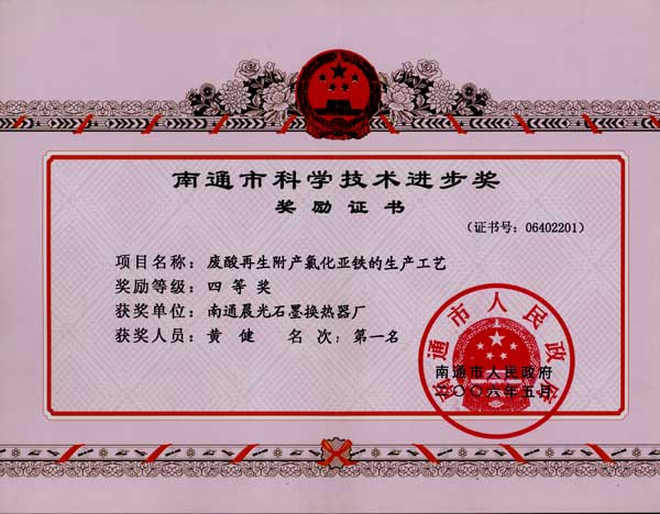 2006年5月,廢酸再生附產(chǎn)氯化亞鐵的生產(chǎn)工藝,榮獲南通市科學(xué)技術(shù)進(jìn)步獎(jiǎng),四等獎(jiǎng)